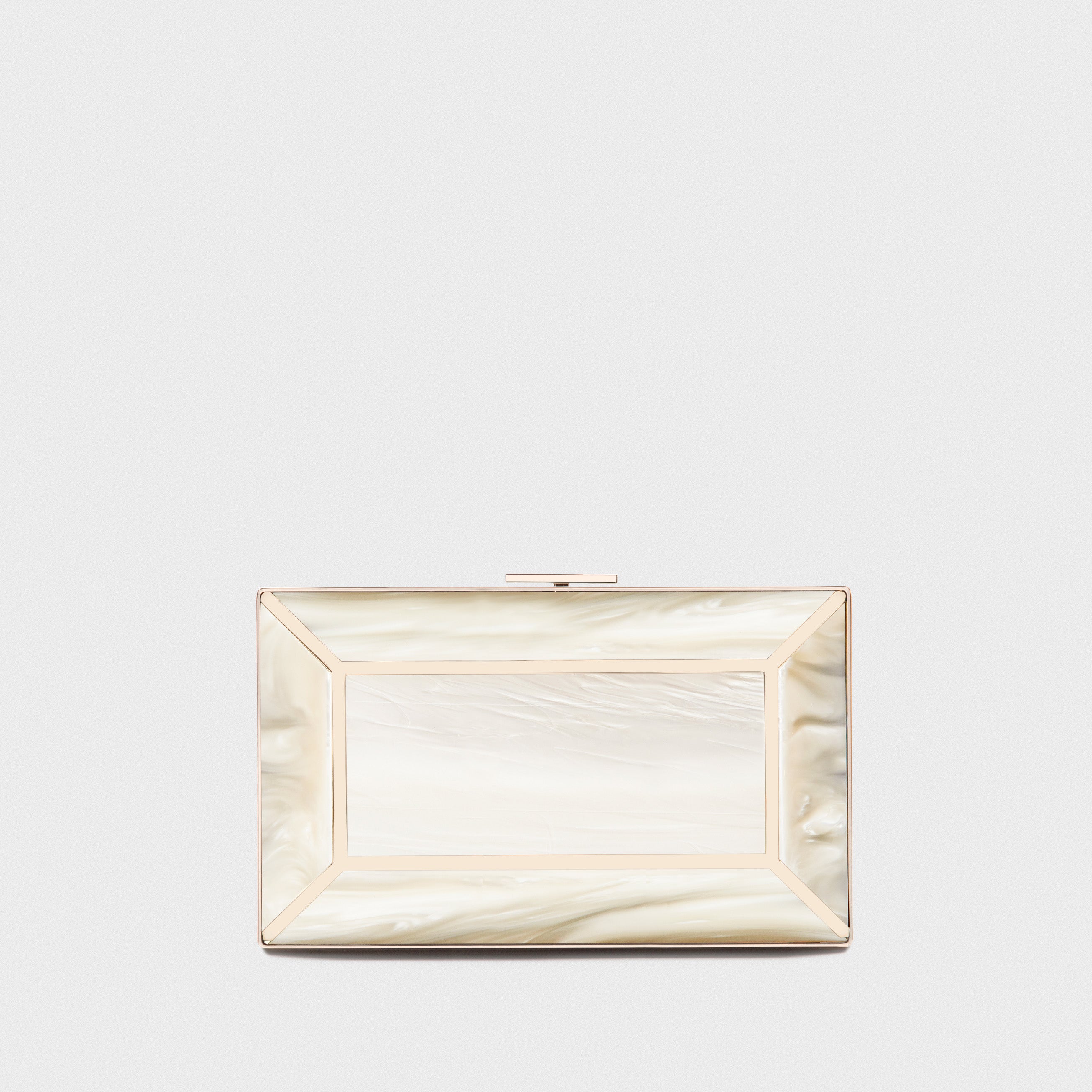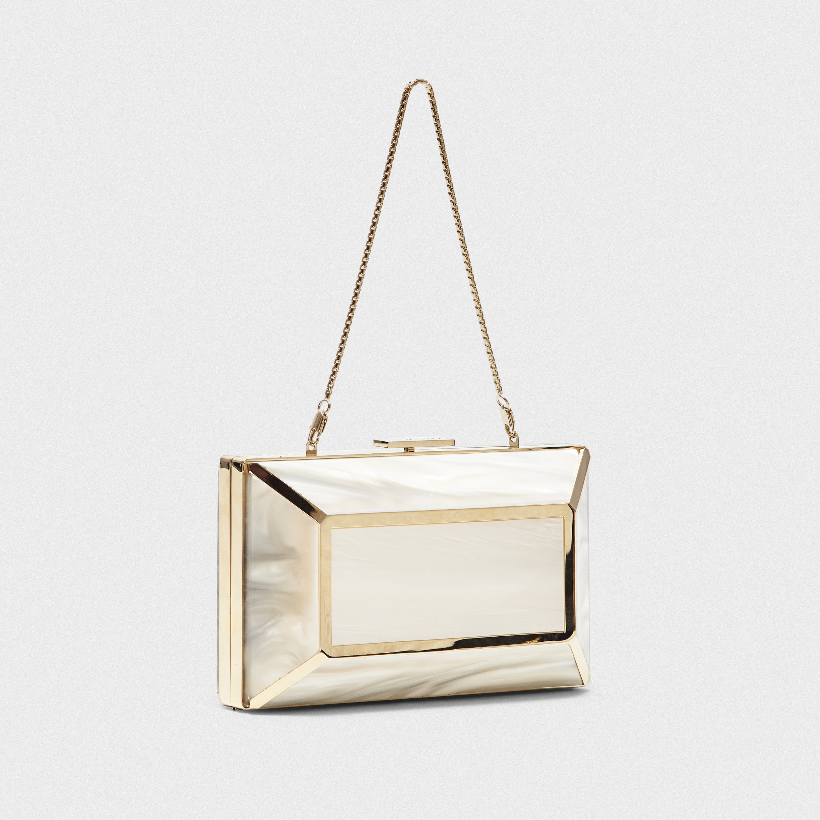 Meet the modern evening clutch. Crafted from luxurious mother of pearl resin, the clutch features a push lock closure, and a gold-tone chain handle. Get ready to make an impact with the Gaia box clutch.